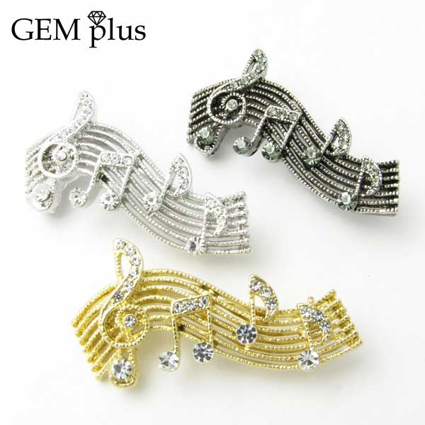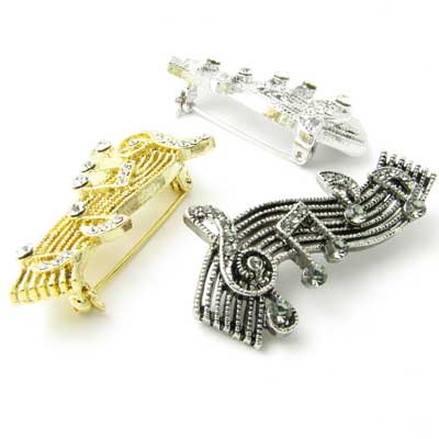 【メール便 送料無料】ト音記号や音符が流れるように配置された華やかなピンブローチ 音楽が聞こえてくるような楽しいデザインです スーツやジャケットの襟もとにはもちろん! バックや帽子などお好きなところに着けて楽しんでください ■素材:合金 ■金具:安全ピン式 ■重さ:約10g ■サイズ:約40mm×22mm